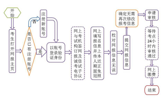 第一步:考生网上填报。准备本人近期正面免冠半身彩色证件照(规格:浅蓝色背景;成像区大小为48mm×36mm<高×宽>,要求上下方向:头部以上空1/10,头颈部占7/10,肩身部占2/10;左右方向:肩身部左右各空1/10;图像像素最小为192×144<高×宽>,图像文件为.jpg格式,文件大小在20KB-200KB之间。不得使用生活照!),在任意一台互联网终端(电脑、PAD、手机等)均可完成填报操作。流程如下图: