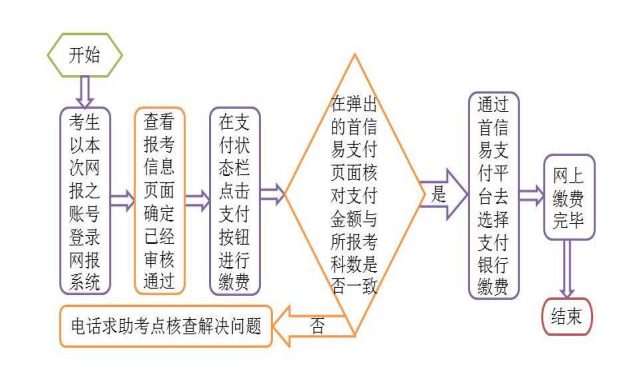 第二步:考生网上缴费。考生等待考点24小时之内审核通过后上网缴纳考试费即可。流程如下图: