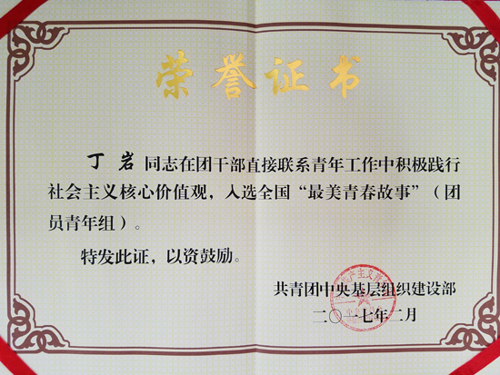 日前,团中央公布了全国团干部直接联系青年工作“最美青春故事”首批入选人员名单,beat365社会发展与公共管理学院2015级硕士研究生丁岩成功入选,这是我省唯一一名入选的高校团员青年。