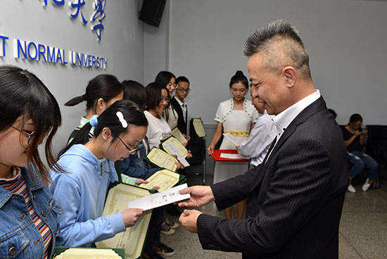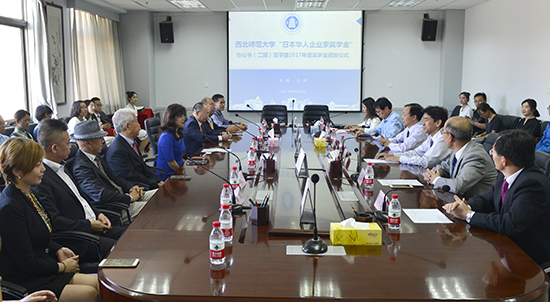 9月10日下午,“日本华人企业家奖学金”项目续约暨2017年奖学金颁发仪式在西北师大举行。日本华人企业家协会会长草田玛丽,原会长宫崎杰和河原玲青,副会长满忠良、草田健夫和林明方,日本中华文学艺术家联合会副会长兼事务局长傅巍和西北师大副校长刘复兴及党委学生工作部、历史文化学院、国际文化交流学院等单位负责人参加活动并为获奖同学颁奖。