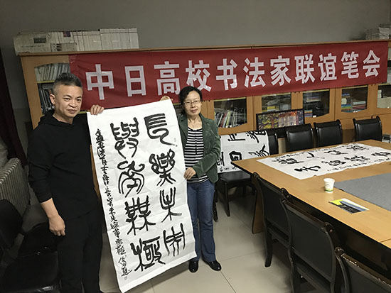签约仪式后,美术学院、书法研究院和日本中华文学艺术家联合会开展了中日高校书法家联谊笔会,双方以“情系丝路”为主题,挥毫拨墨,共同探讨书法文化。笔会书法作品将择优参展第二届丝绸之路(敦煌)国际文博会期间西北师大主办的“一带一路”高校联盟书法展。
