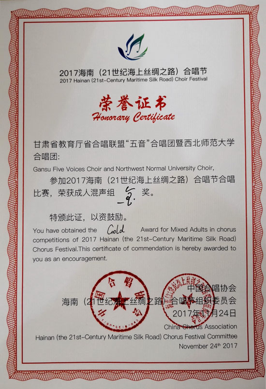 在11月24日晚闭幕的2017海南“21世纪海上丝绸之路合唱节”上,甘肃省教育厅省合唱联盟“五音”合唱团暨beat365官方网站合唱团表演的大型原创合唱音诗《天鹅琴》,从来自国内外的78个代表队中脱颖而出,荣获成人混声组金奖。