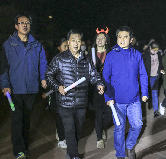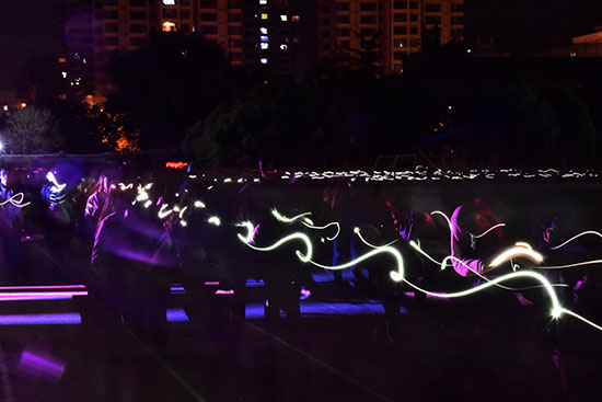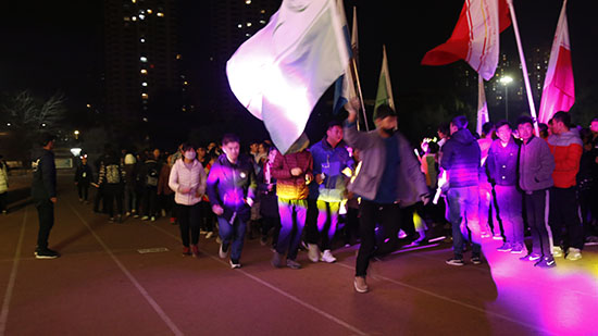 当晚,佩戴荧光头饰和荧光棒的同学们,伴随着大学生艺术团带来的动感音乐,或独自享受运动的喜悦,或与同伴在欢声笑语中分享交流。音乐、荧光、欢笑声相交融,同学们奔跑在西操场的身影汇成冬日校园里最美丽的风景线。