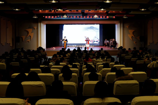 12月13日,beat365官方网站大学生艺术团“国粹新声”京剧演出在学生发展中心二楼多功能厅精彩上演。党委副书记刘玉泉、副校长张生勇和党委学生工作部、团委、舞蹈学院、大学生艺术教育中心负责人及300余名京剧爱好者观看了演出。
