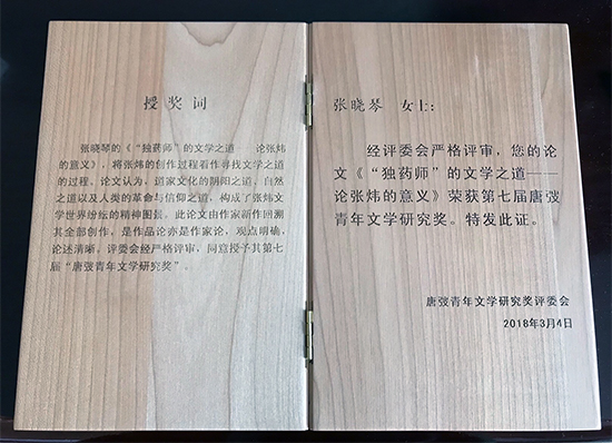 评委给张晓琴《“独药师”的文学之道——论张炜的意义》的颁奖词中说:“将张炜的创作过程看作寻找文学之道的过程。论文认为,道家文化的阴阳之道、自然之道以及人类的革命与信仰之道,构成了张炜文学世界纷纭的精神图景。此论文由作家新作回溯其全部创作,是作品论亦是作家论,观点明确,论述清晰。评委会经严格评审,同意授予其第七届唐弢青年文学研究奖。”