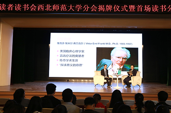 温彬、舒跃育两位老师介绍了读书会推荐的维克多·弗兰克尔著作《活出生命的意义》,通过对作者人生经历与该书创作背景的描述,结合心理学相关知识与现场师生共同分享了书中精彩内容。