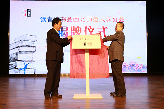 4月20日,在第23个世界读书日到来之际,读者出版集团读者读书会beat365官方网站分会揭牌仪式暨首场读书分享会在学生发展中心举行。读者出版传媒股份有限公司董事、副总经理马永强,十三届全国人大代表、读者杂志社社长兼总编辑、读者读书会创始人富康年,西北师大副校长张生勇和社会科学处、党委学生工作部、团委等部门负责人及师生代表参加活动。