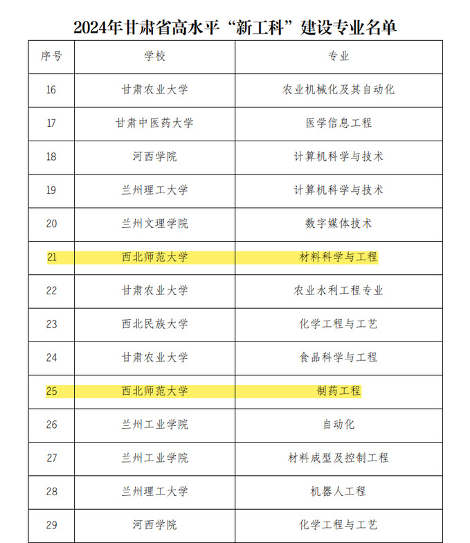 近日,甘肃省教育厅发布《甘肃省教育厅关于公布2024 年甘肃省高水平“四新”建设高校、专业认定结果的通知》,西北师大被遴选认定为2024年甘肃省高水平“新文科”建设高校。学校计算机科学与技术、材料科学与工程、制药工程3个专业被遴选认定为2024年甘肃省高水平“新工科”建设专业;汉语言文学、历史学、体育教育3个专业被遴选认定为2024年甘肃省高水平“新文科”建设专业。