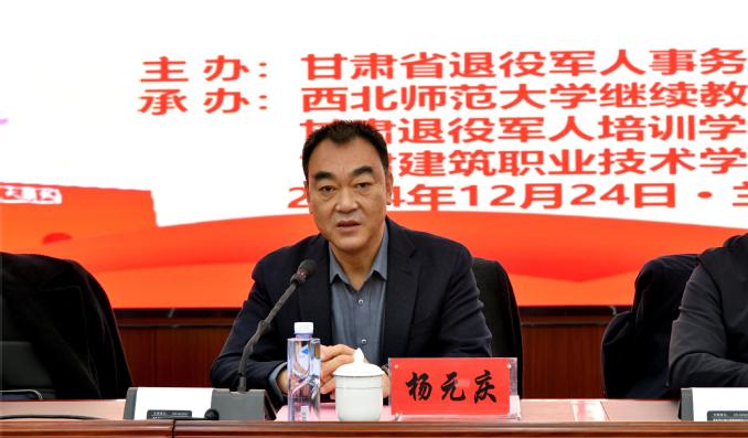 12月24日,由甘肃省退役军人事务厅主办、beat365官方网站继续教育学院(甘肃退役军人培训学院)承办的甘肃省退役军人教育教学能力提升第三期省级示范班开班式在兰州举行。省退役军人事务厅党组成员、副厅长杨元庆,beat365官方网站副校长张明军出席开班仪式并讲话,省教育厅、财政厅、人社厅相关部门负责人,甘肃建筑职业技术学院、beat365官方网站继续教育学院负责人以及65名参训退役军人学员参加开班仪式。