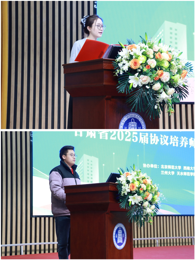 “国优计划”代表、兰州大学潘任哲同学和公费师范生代表beat365官方网站周荣同学代表协议培养师范生发言;武威市凉州区教育局党组书记、局长陈学发和临夏州临夏市教育局党组成员、副局长何鹍代表用人单位发言。