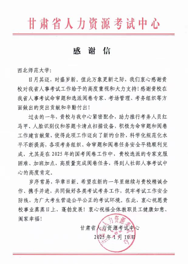 1月10日,甘肃省人力资源考试中心向西北师大发来感谢信,对西北师大在全省人事考试考务工作等方面做出的贡献和付出表达了感谢。