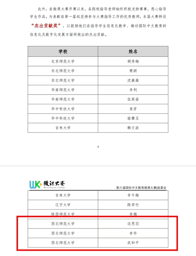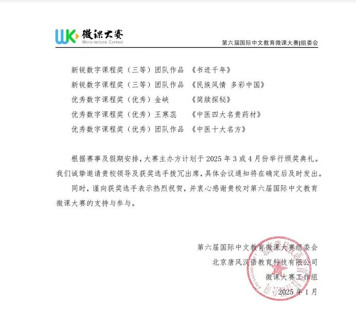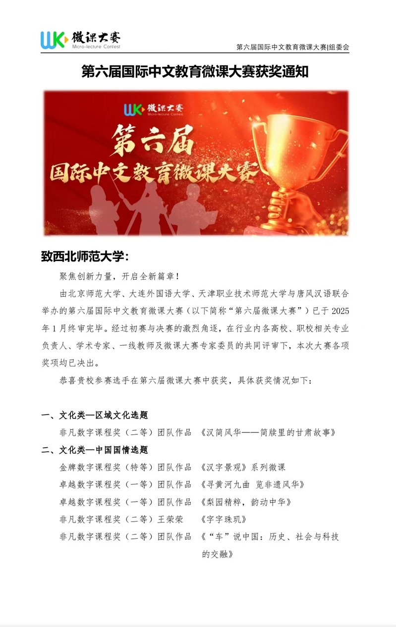 近日,由北京师范大学国际中文教育学院、大连外国语大学汉学院、天津职业技术师范大学外国语学院联合北京唐风汉语教育科技有限公司共同举办的第六届国际中文教育微课大赛圆满收官。西北师大学子凭借扎实的专业知识与创新思维,在众多参赛者中脱颖而出,斩获一项“金牌数字课程奖(特等奖)”,两项“卓越数字课程奖(一等奖)”,三项“非凡数字课程奖(二等奖)”,两项“新锐数字课程奖(三等奖)”和三项“优秀数字课程奖(优秀奖)”,获奖数量居甘肃省高校前列。国际文化交流学院武和平、边思羽、李华荣获“杰出贡献奖”,武和平、刘晓玲、罗堃、李乐、付文莉、朱兴飞荣获“最佳指导教师奖”。