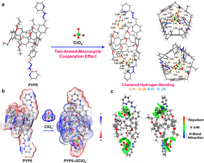 图2:簇状氢键结合 ClO4−:效应和机制。a PYP5 和 PYP5⊃2ClO4−的单晶结构及其侧视图、俯视图展示了基于双臂大环协同的集簇氢键。b PYP5和PYP5⊃2ClO4−的ESP(静电势分布)图。c 通过IGMH方法并基于单晶数据对“集簇氢键”从不同视角进行可视化展示。