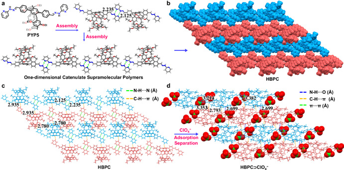 图1:氢键超分子聚合物网络晶体(HBPC)的组装和单晶结构。a PYP5二聚体和一维链状超分子聚合物。b HBPC的孔结构。c HBPC中的氢键。d HBPC⊃ClO4−的单晶结构。
