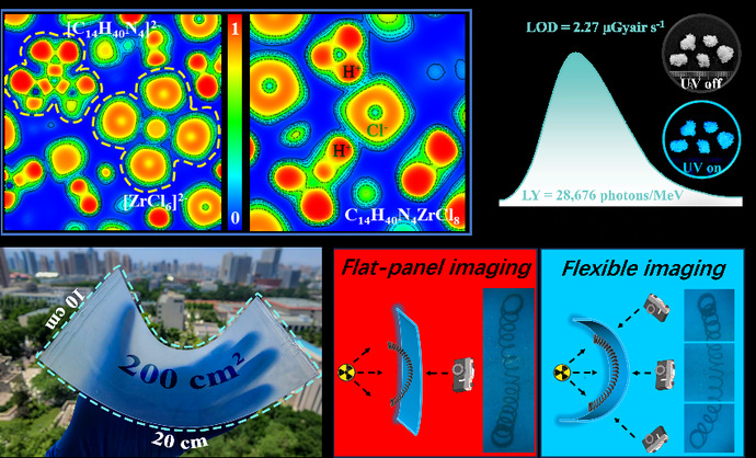 该课题组积极发挥理论模拟计算的导向优势,基于第一性原理的分子结构设计,构筑并合成了新型的零维有机-无机杂化锆基金属卤化物闪烁体材料,通过分子工程引入大体积的有机阳离子构筑了高性能的零维结构,基于显著的空间位阻和量子限域作用,形成了高效的自陷态激子发光,最终实现了高性能的柔性X射线成像。