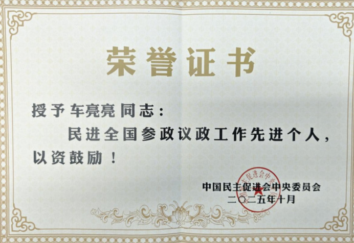车亮亮作为民进西北师大支部副主委,始终立足本职岗位,聚焦民生热点和行业发展等重点领域,深入开展调研、积极建言献策。近年来,累计撰写社情民意信息近20件,报送多件提案素材,其中2件被全国政协采纳、3件被民进中央采纳、1件获得省领导批示,为推动相关政策落地见效发挥了积极作用。车亮亮曾多次获得参政议政工作奖励,包括2023、2024年民进中央参政议政优秀成果二等奖,2022、2023年民进甘肃省参政议政工作先进个人等荣誉。
